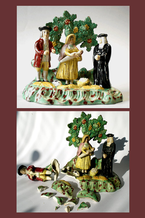 three-figures Early 19th century Staffordshire Tythe group needing reconstruction. Staffordshire Tythe Figure